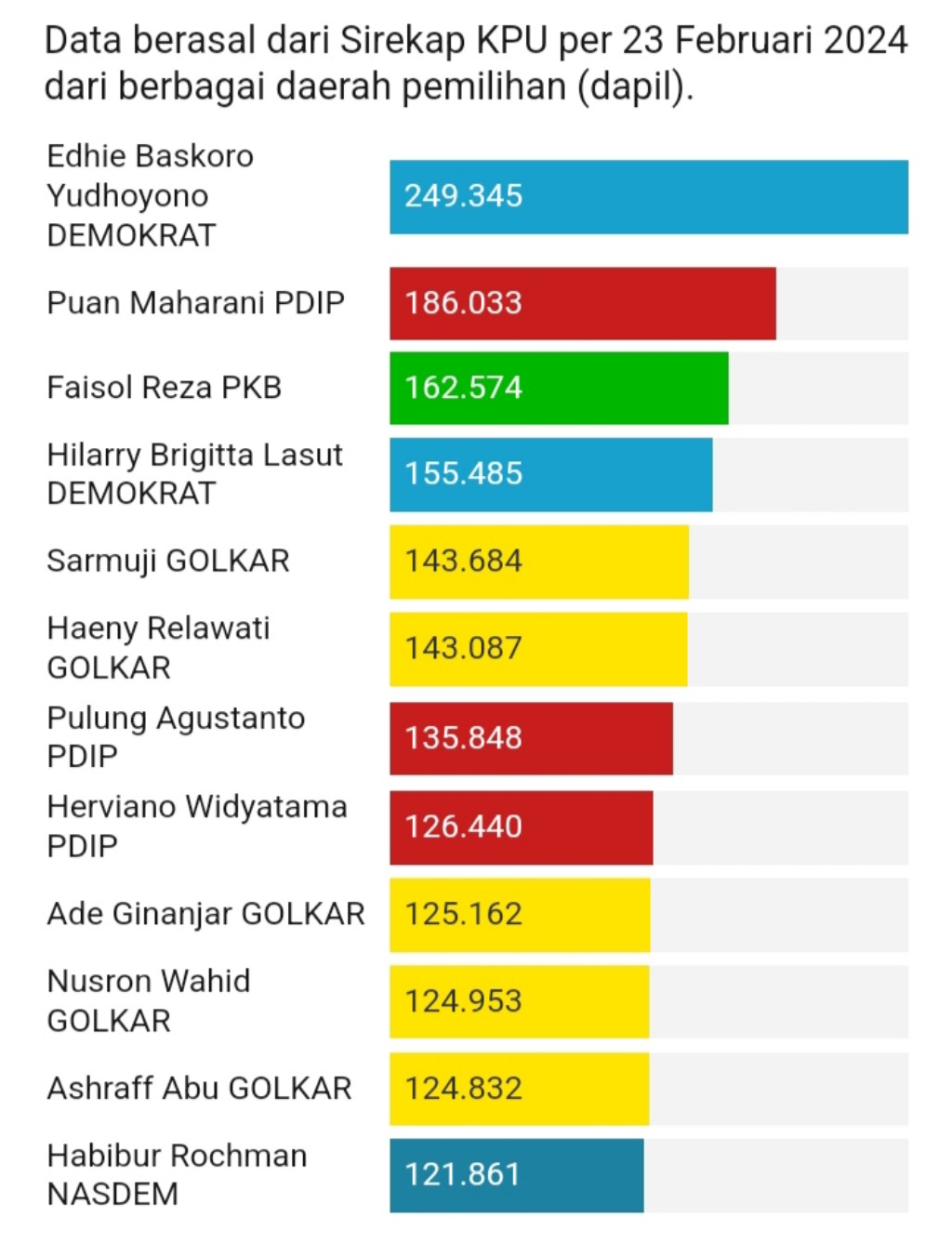 Berikut rincian para caleg dengan perolehan suara terbanyak se-Indonesia dari berbagai dapil per 23 Februari 2024 merujuk data Sirekap KPU.