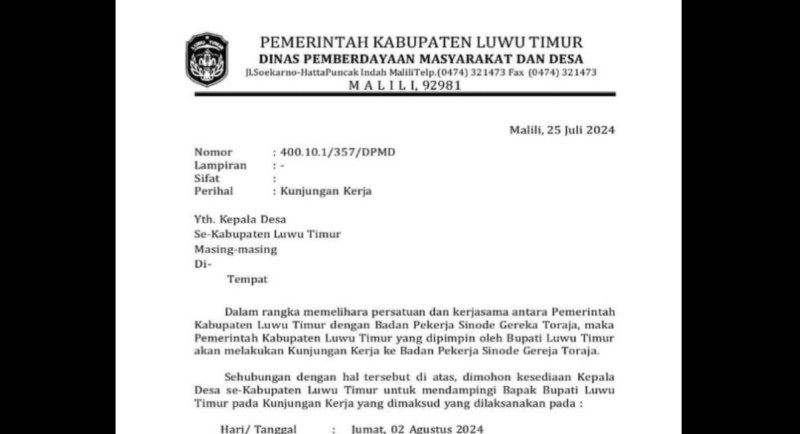 “Lagi-lagi desa-desa di Luwu Timur akan melakukan kegiatan kunjungan kerja yang sama sekali kami anggap tidak bermanfaat bagi desa. Dimana terlihat dengan adanya surat perintah yang dibungkus permohonan dari Kepala Dinas PMD Kabupaten Luwu Timur, yang meminta kepala desa untuk mendampingi Bupati Luwu Timur Budiman untuk melakukan kunjungan kerja,” tegas Iskar dalam keterangannya, Kamis (1/8/2024).