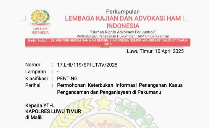 LHI berharap surat ini segera ditindaklanjuti oleh Kapolres Luwu Timur dengan memberikan informasi resmi secara tertulis, sebagai bentuk kepatuhan terhadap prinsip keterbukaan informasi publik, khususnya dalam penanganan perkara yang menyangkut hak asasi dan rasa keadilan korban. (FSL)