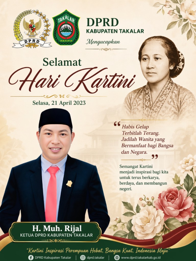 TAKALAR – Ketua DPRD Kabupaten Takalar, Sulawesi Selatan, H. Muhammad Rijal Tawang, menyampaikan ucapan Selamat Hari Kartini yang jatuh pada 21 April 2026. Dalam kesempatan tersebut, beliau menekankan pentingnya semangat emansipasi dan peran aktif perempuan dalam pembangunan nasional. Ia mendorong perempuan Indonesia untuk terus berdaya, berinovasi, serta meneladani perjuangan R.A. Kartini demi kemajuan bangsa.