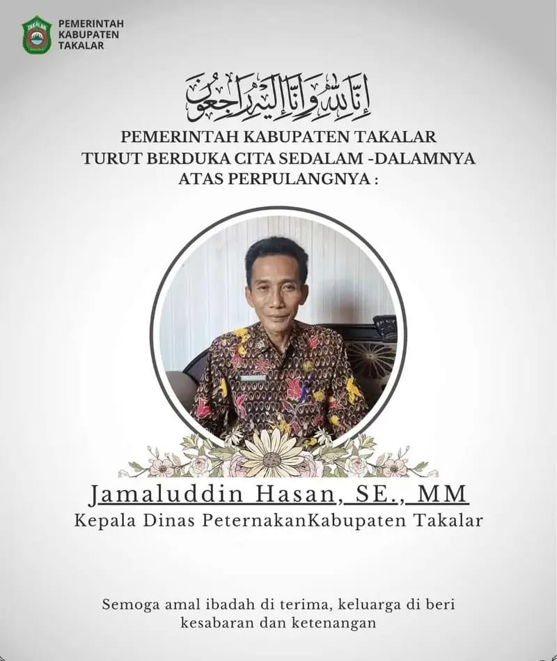 TAKALAR – Kabar duka menyelimuti jajaran Pemerintah Kabupaten Takalar. Kepala Dinas Peternakan dan Kesehatan Hewan Kabupaten Takalar, Jamaluddin Dg. Sese, dikabarkan wafat pada 20 April 2026.